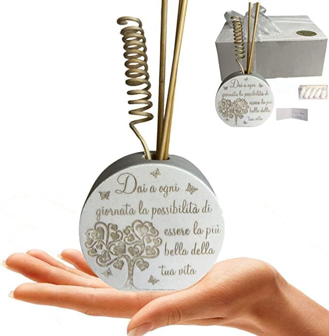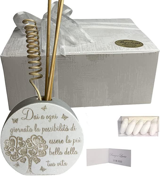 Diffusore in pietra 8,5cm x 8cm completo di scatola, essenza, bacchette assorbenti, confetti, nastro e bigliettino personalizzato (comunicare via chat: il tipo di cerimonia, il nome/i nomi e la data della cerimonia)