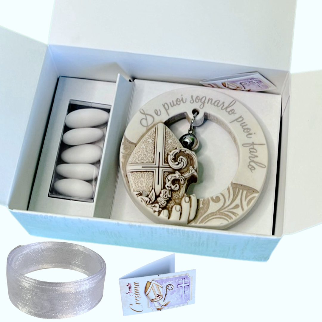 Quadretto per Santa Cresima 9cm x 8,5cm con campanello, compreso di scatola, nastro e bigliettino personalizzato (comunicare via chat: il nome/i nomi e la data della cerimonia)